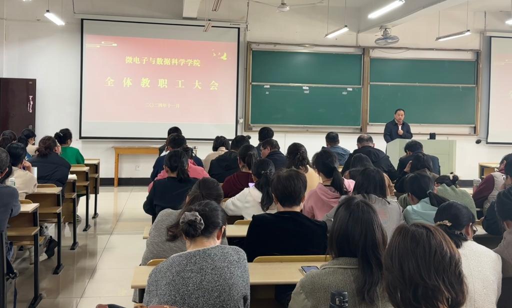 2024年11月11日下午,微电子与数据科学学院在数理楼403召开全院教职工大会。会议由学院党委书记汪春胜主持,学院全体教职工参会。