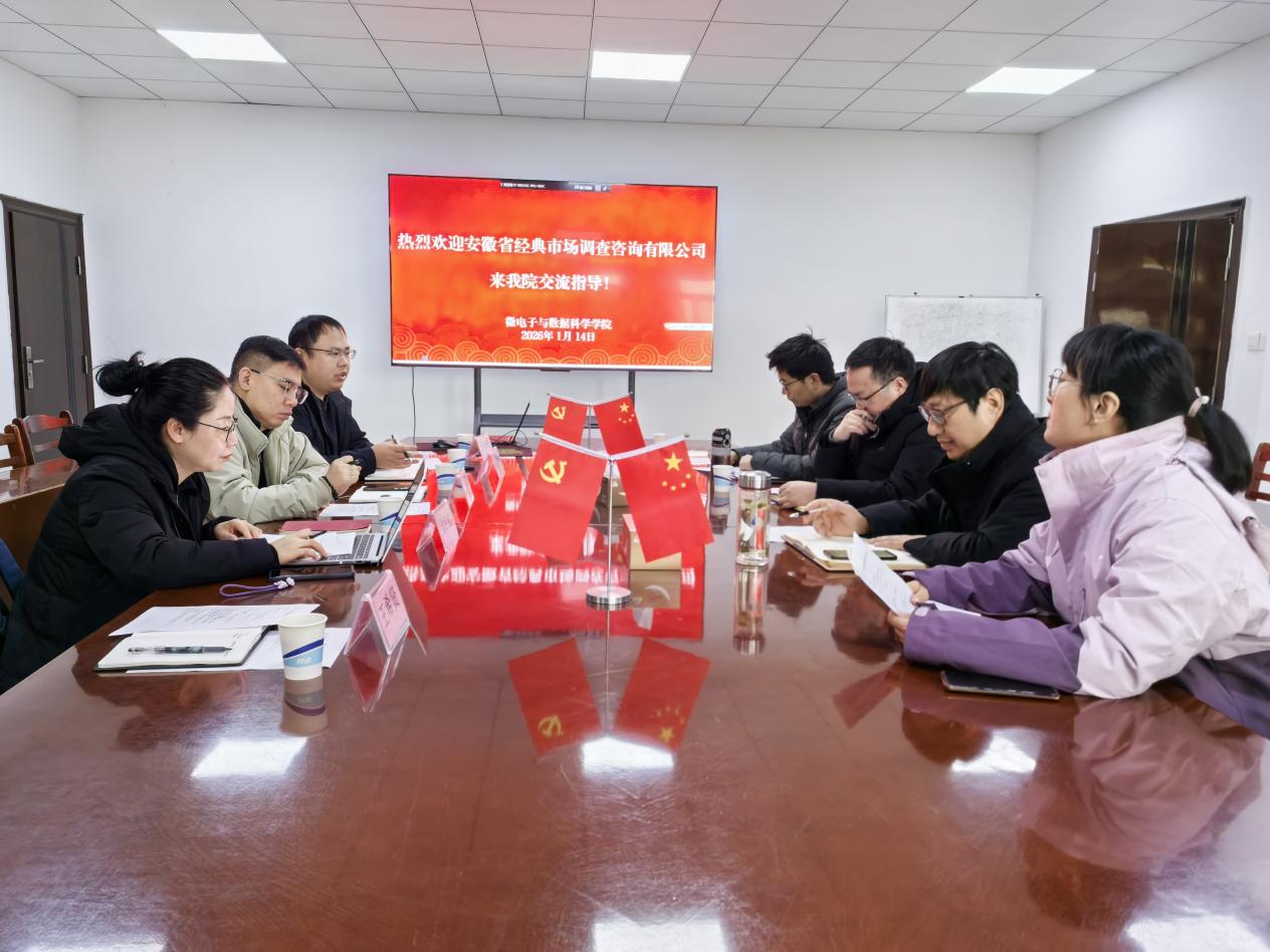 1月14日上午,安徽经典市场调查咨询有限公司副总翟奇林一行5人来访微电子与数据科学学院,就联合共建学科实验室、多模态数据协同研发平台、产教融合人才培养等议题开展深入交流讨论。交流会由副院长李文喜主持,李勇副院长和数据科学系负责人参加了交流研讨。
