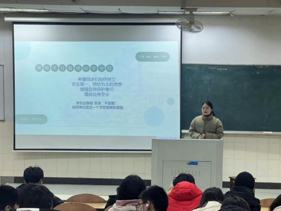 为切实加强假期安全教育,增强学生安全防范意识,1月9日晚,微电子与数据科学学院在阶教101召开“快乐过寒假,安全记心中”寒假安全教育大会,会议由辅导员王小花主讲,全体23级学生参会。