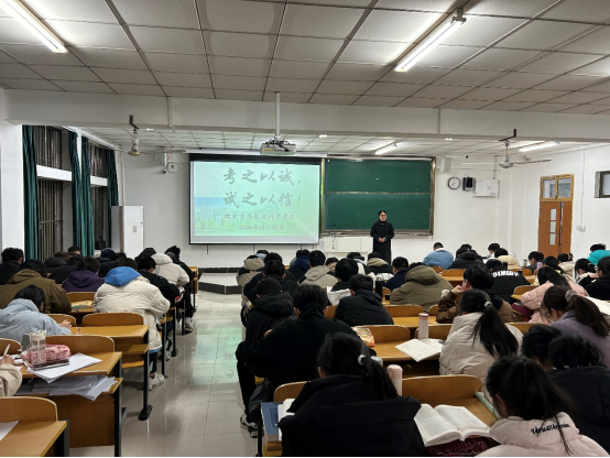 为强化考试管理,严正考风考纪,做到知底线、守红线、不越线,12月26日,微电子与数据科学学院在东教103召开了“考之以诚,试之以信”--诚信考试教育暨期末动员大会,辅导员王小花主讲,2023级学生参加。