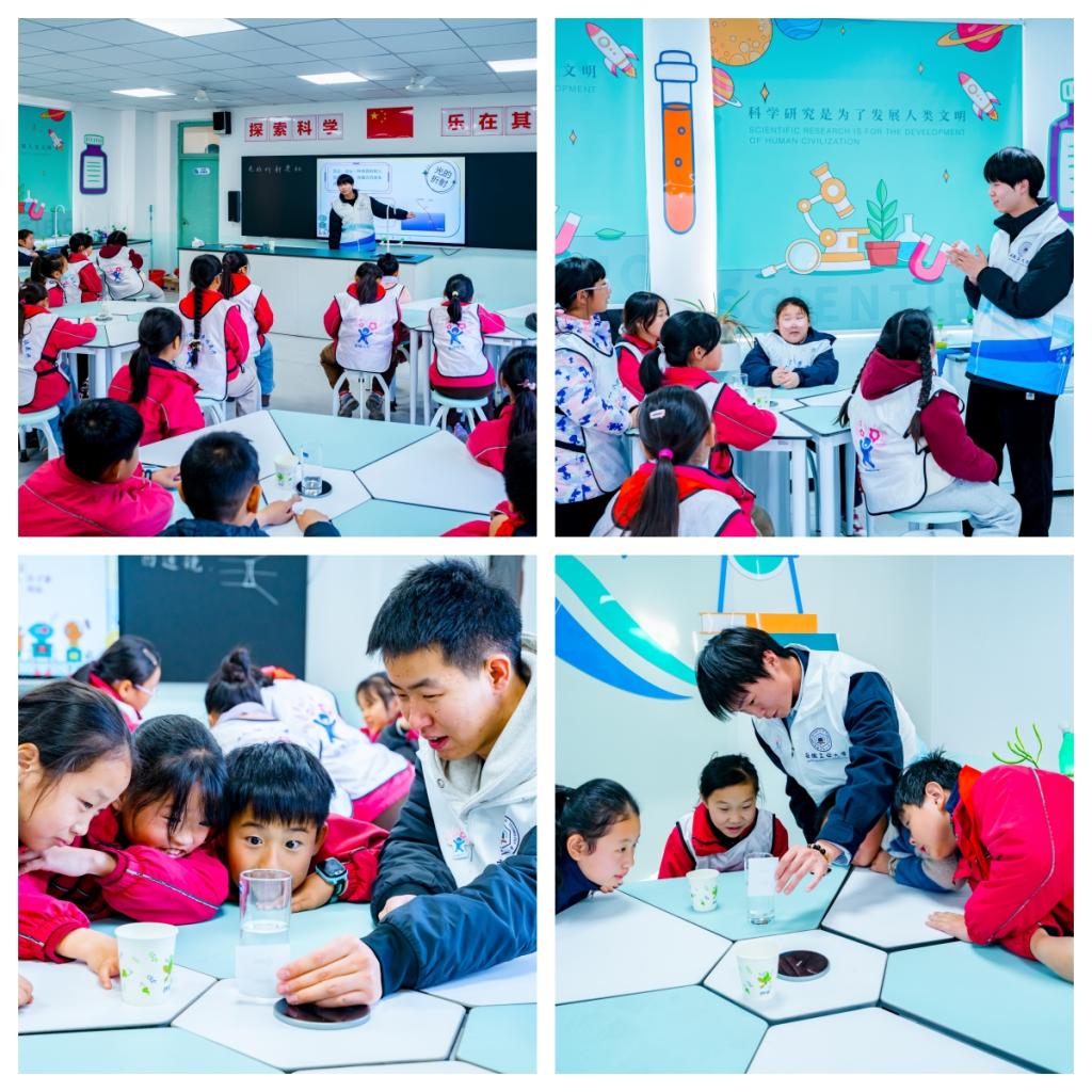 12月8日,微电子与数据科学学院“数理行知”科普志愿队携手花山区金家庄街道“幸福花花”服务项目,走进新工房小学,以“光的折射”为主题开展科普活动。