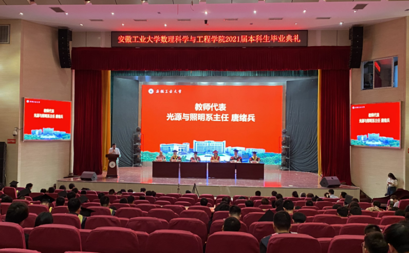 教师代表光源与照明系主任唐绪兵发言,同学们将满载着知识,承载着母校的精神和嘱托,开启新的人生征程,希望同学们心怀梦想逐梦前行,脚踏实地唯实求真,始终秉承“精工博学,厚德敏行”校训精神,不负韶华,书写青春华章。