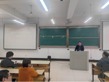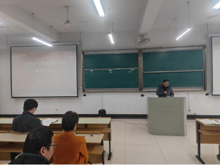 11月13日下午,微电子与数据科学学院在数理楼403室召开全院教职工大会,学院全体教职工参加会议,会议由学院党委书记汪春胜主持。