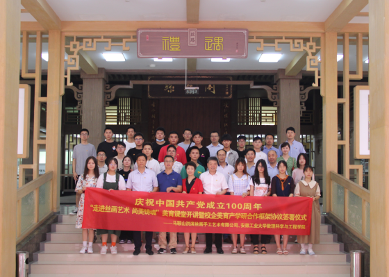 6月30日上午,安徽工业大学数理科学与工程学院与马鞍山市洪滨丝画手工艺术有限公司校企美育产学研合作框架协议签署仪式在马鞍山中国丝画院隆重举行。马鞍山市人大常委会副秘书长曹化根,中国工艺美术大师、洪滨丝画手工艺术有限公司总经理袁洪滨,车间主任曹业翠、总经理助理黄静芳,数理学院领导班子以及光电系师生代表参加签约仪式。