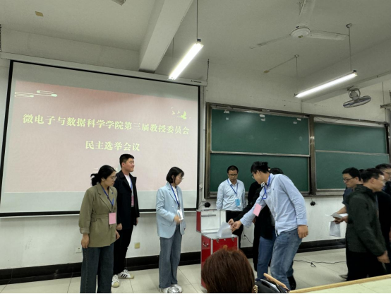 会议首先进行了学院第三届教授委员会委员民主选举,杨二光宣读了微电子与数据科学学院第三届教授委员会委员候选人名单,详细介绍选举程序、选票填写说明。大会通过了选举总监票人、监票人和计票人名单。随后,全院教职工进行无记名投票,选举出新一届教授委员会委员,选举总监票人孙文斌当场宣布选举结果。