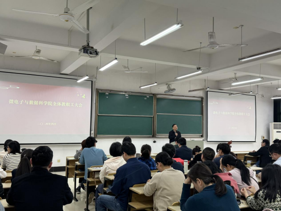 2024年4月29日下午,微电子与数据科学学院在数理楼403召开全院教职工大会暨第三届教授委员会委员换届选举大会。学院全体教职工参加了本次会议,会议由院长杨二光主持。