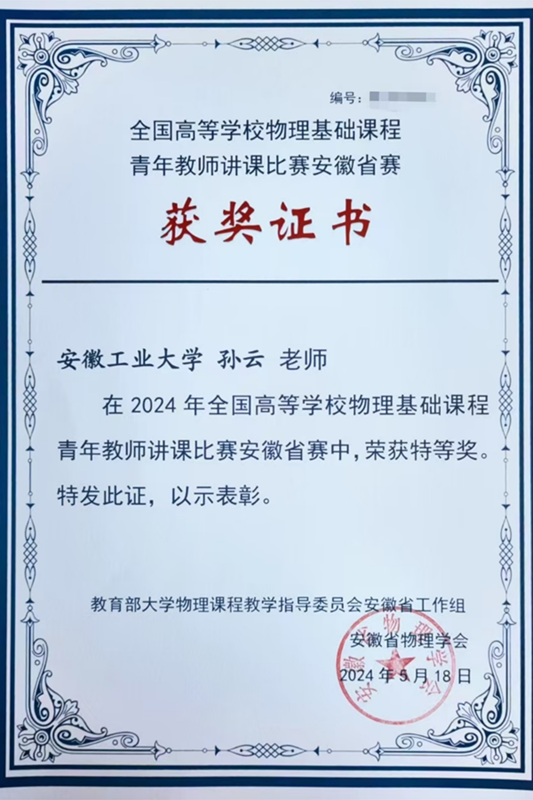 5月16至18日,2024年全国高等学校物理基础课程青年教师实验教学讲课比赛省赛在安庆师范大学举行。经过激烈的角逐,微电子与数据科学学院教师孙云凭借出色的表现获特等奖(第一名),并被推荐参加华东赛区复赛。