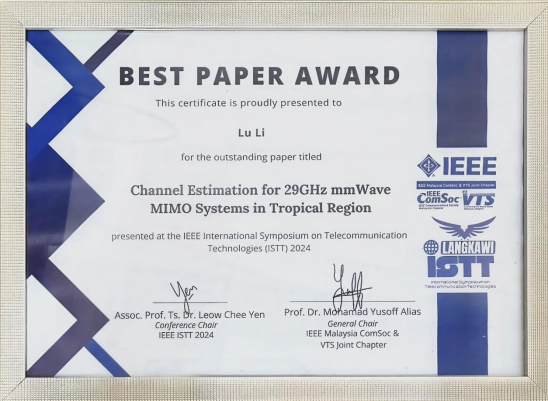我院教师鲁力博士在ISTT 2024上凭借其论文《Channel Estimation for 29GHz mmWave MIMO Systems in Tropical Region》获得了“最佳论文奖”,这一荣誉标志着他在高频毫米波通信技术研究中的创新性贡献得到了国际权威认可。该论文的研究聚焦于在热带气候下的毫米波信道估计难题,为未来通信系统的可靠性和精确性提供了有效解决方案。此研究成果不仅推动了毫米波通信技术在复杂环境下的应用,也为相关领域的后续研究提供了宝贵参考。