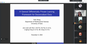 王亚飞老师介绍了她的最新科研成果,若干个服务器之间的信息传递会导致个人信息的泄露,如何保护数据隐私这一重要课题。介绍了他们团队提出的一种可以保护数据隐私的DP-DL学习框架,并给出了所提算法的泛化误差估计和有限样本的性质,从理论上给出了隐私保护怎样受局部服务器的影响的全局解。最后基于广义高斯分布,提出了一种新的加噪声的机制。