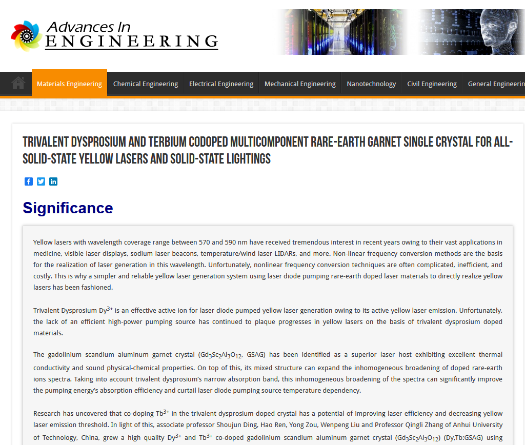 近日,数理学院光学功能晶体与器件研究团队发表在《Journal of Materials Chemistry C》(影响因子7.393)上的研究论文(Single crystal growth and property investigation of Dy3+and Tb3+co-doped GSAG: multiple applications for GaN blue LD pumped all-solid-state yellow laser and UV or blue light chip excited solid-state lighting)被国际著名科技机构“Advances In Engineering”(简称AIE)遴选为关键科学文章(key scientific article),并以“Trivalent dysprosium and terbium codoped multicomponent rare-earth garnet single crystal for all-solid-state yellow lasers and solid-state lightings”为题在材料工程(Materials Engineering)栏目进行专题报道。团队教师丁守军为第一作者,丁守军和中科院合肥研究院张庆礼研究员为共同通讯作者。