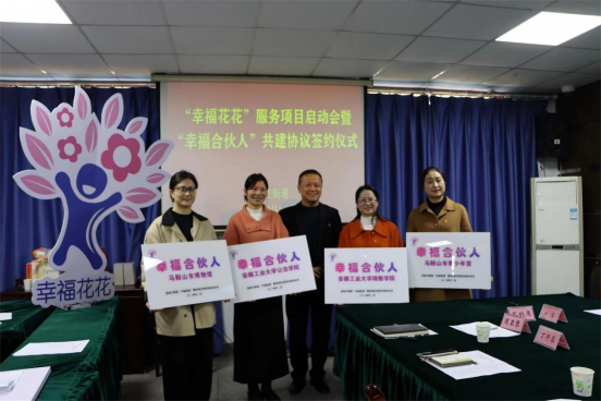 3月11日,花山区金家庄街道举行“幸福花花”服务项目启动仪式,共青团花山区委、微数学院、花山区妇联、花山区人民检察院等首批“幸福合伙人”单位代表参与了启动仪式,就共建工作进行了深入交流,并现场签署共建协议。签约仪式上,学院研究生党支部支部书记宋二银老师就共建工作进行了深入交流。