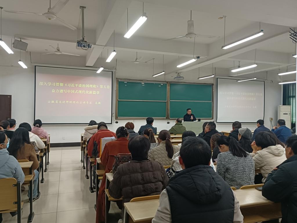 11月27日下午,微电子与数据科学学院举行《习近平谈治国理政》第五卷专题辅导报告会。会议邀请安徽省委讲师团高端宣讲专家、图书馆馆长高敏教授以《深入学习贯彻〈习近平谈治国理政〉第五卷,奋力谱写中国式现代化新篇章》为题作专题辅导。报告会在数理楼403室举行,全院教职工参会,会议由学院党委书记汪春胜主持。