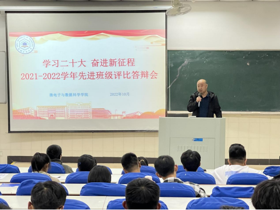 为进一步加强学生思想政治教育工作,充分发挥先进典型的教育、引导、激励作用,10月23日晚,微电子与数据科学学院在东校区阶梯教室102举办“学习二十大,奋进新征程”2021-2022学年先进班级评比交流会,学院党委副书记、纪委书记、副院长郭宏,各年级辅导员出席并担任评委,2022级新生代表参加了评比交流会。