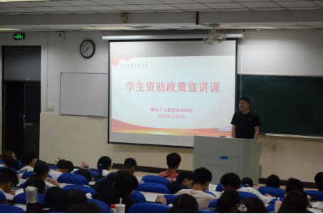 11月5日,微电子与数据科学学院在阶教102教室开展了2023年学生资助政策“两节课”活动,学院资助联系人张佳良主讲,23级辅导员王小花、2023级全体新生参加活动。